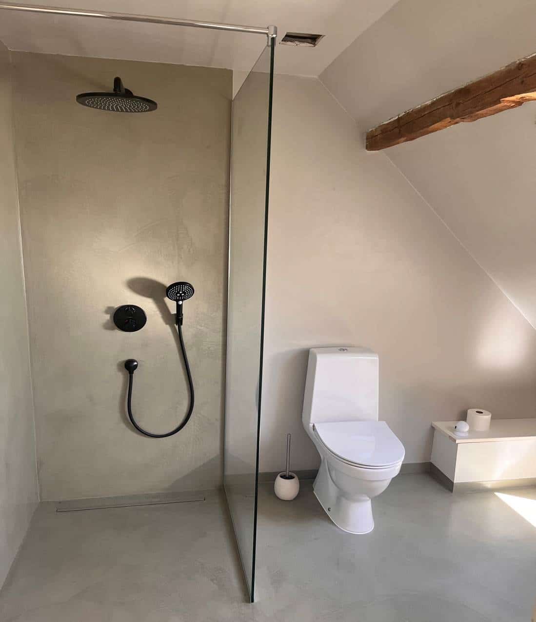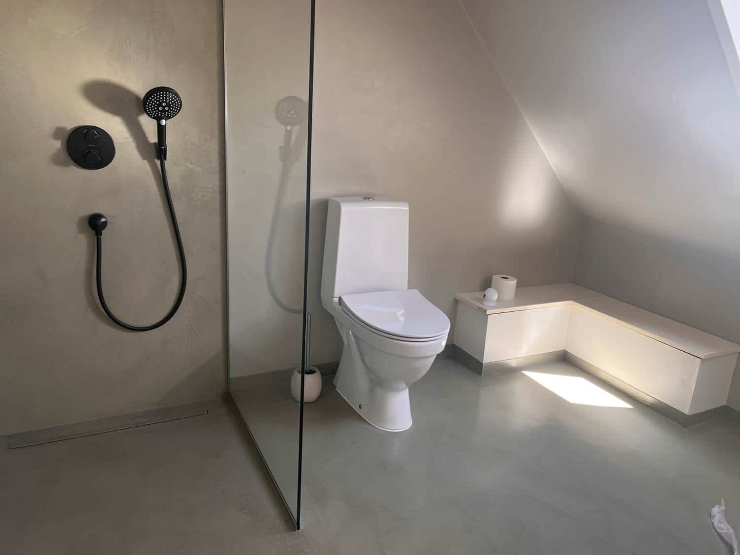 Træt af dit gamle badeværelse, klinkegulve og grimme fuger, så er microcement løsningen, få et badeværelse uden fuger.